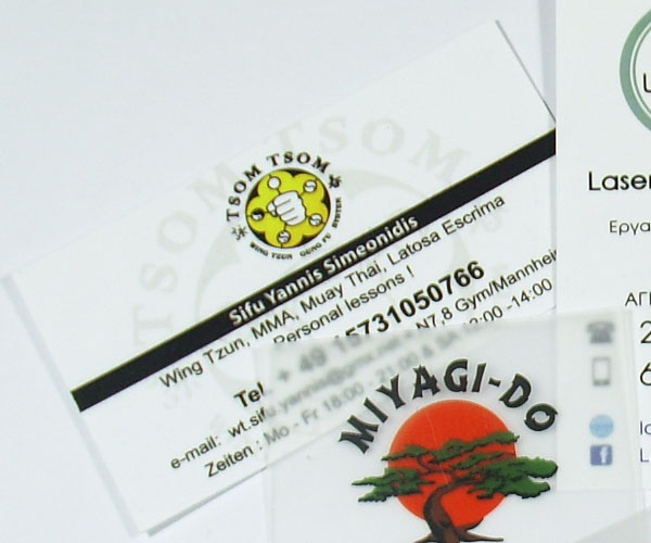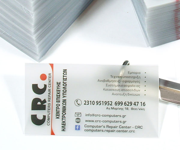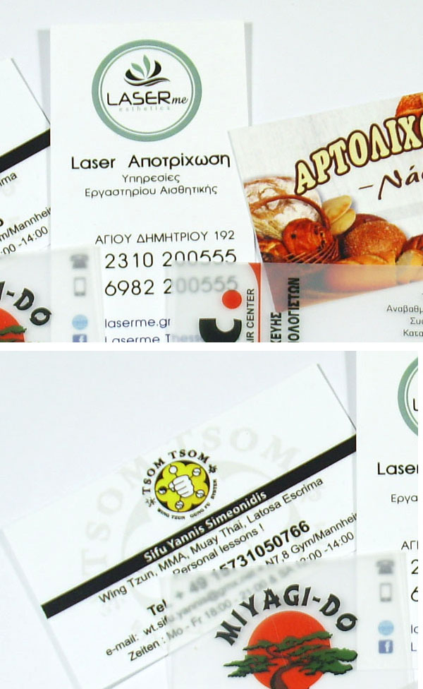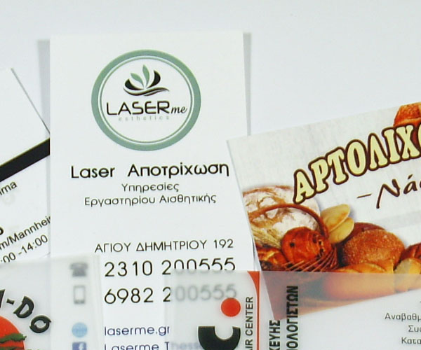 Kάρτες πλαστικές τυπωμένες σε αδιαφανές λευκό PVC για επαγγελματική η προσωπική χρήση. Η εκτύπωση πλαστικών επαγγελματικών καρτών γίνεται σε 1 η 2 πλευρές του πλαστικού φύλλου (33 Χ48 cm) με τη μέθοδο ψηφιακής εκτύπωσης με χρώματα.